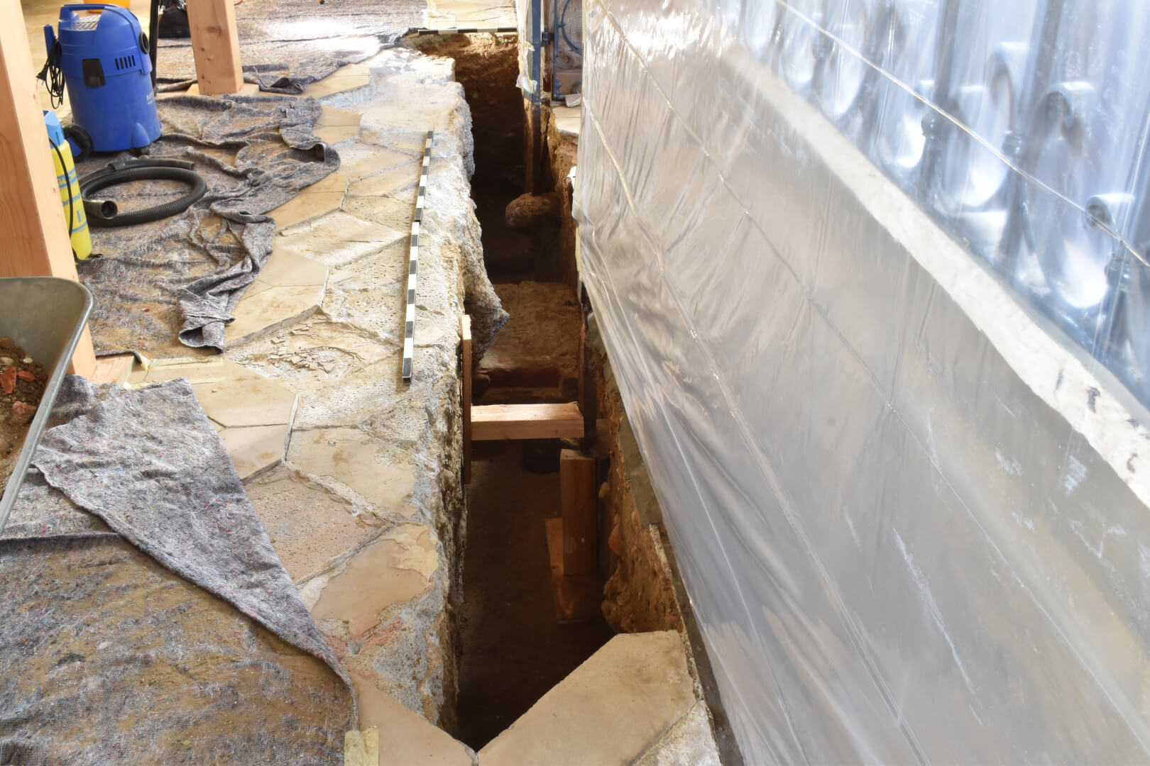 Die Solnhofer Kalkplatten wurden entfernt, um an die darunterliegende Grabungsfläche zu gelangen. Plastikfolien schützten das Kircheninterieur vor Beschädigung.