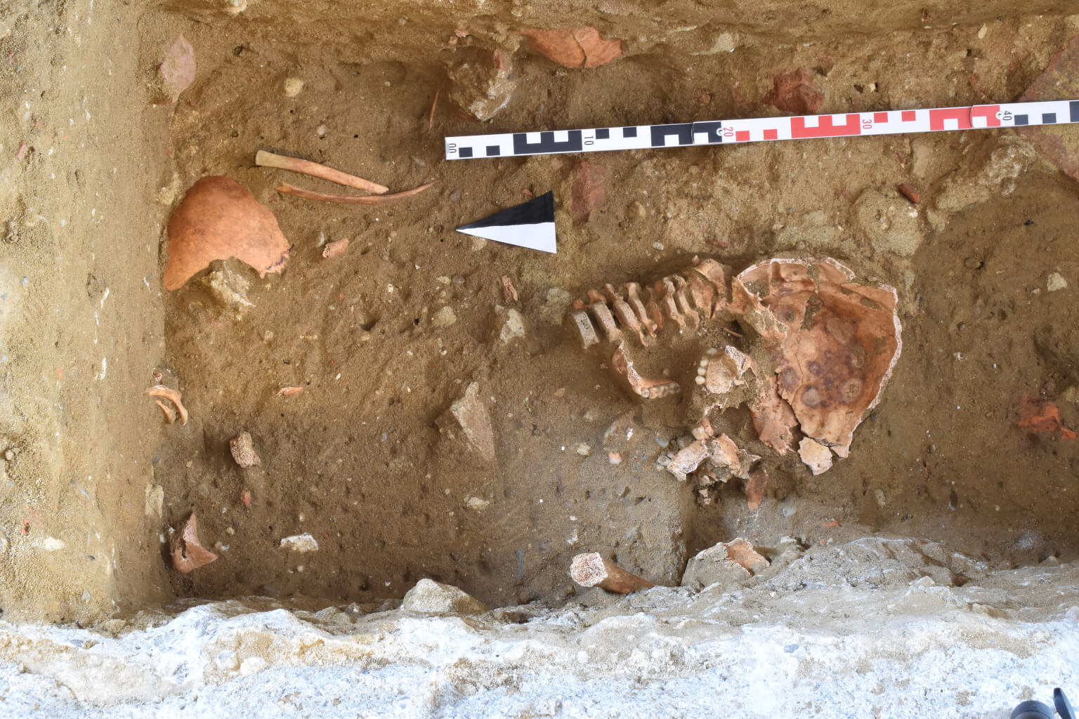 Tiefer im Erdreich stießen wir auf eine Backsteinmauer, die quer zum Schnitt verlief. Aufgrund ihrer Lage wurde sie als ältester Befund identifiziert. Spannender erwies sich das umliegende Erdreich: Denn das war durchsetzt von menschlichen Knochen.